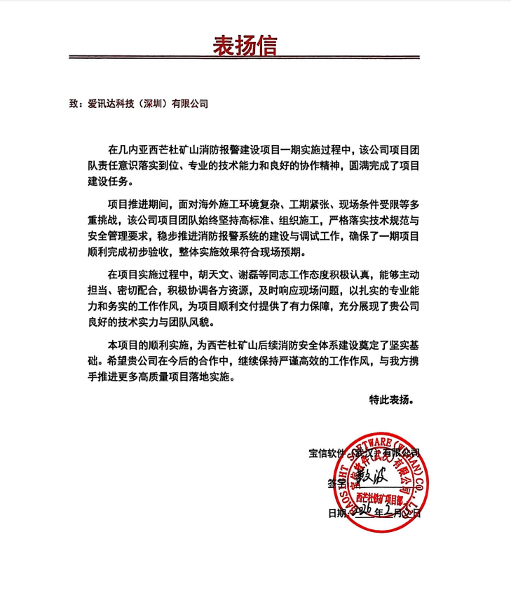 2026年2月3日,在总包方带领下顺利完成消防报警系统第一阶段验收工作。系统运行稳定,各项功能指标满足设计及验收要求,得到了业主方的高度认可。此次阶段性成果的取得,标志着我司在非洲矿山消防报警及弱电系统集成领域的技术能力和项目执行水平再次得到充分验证。